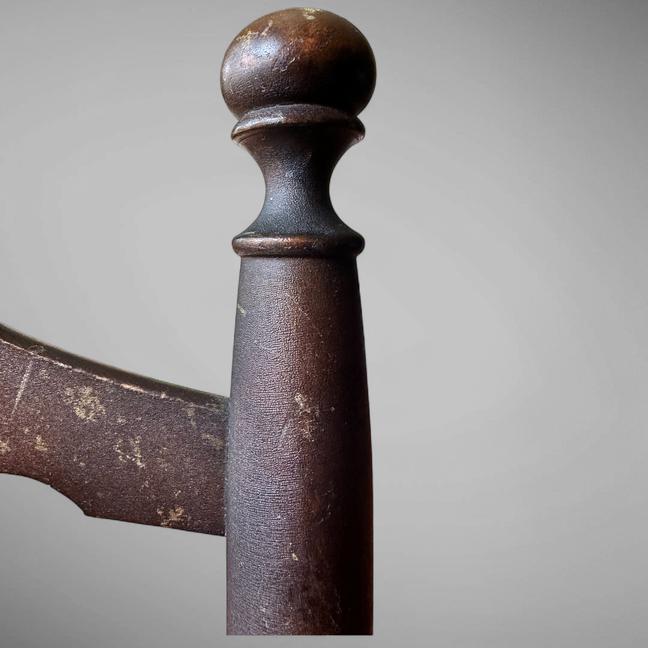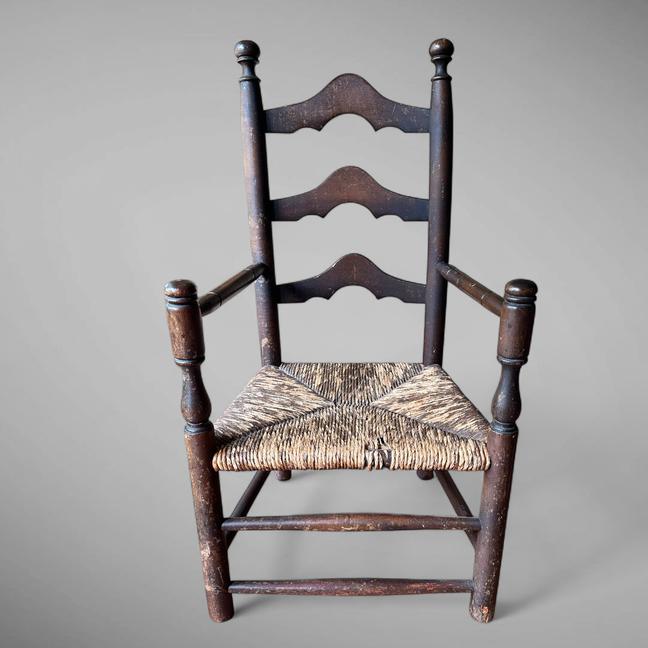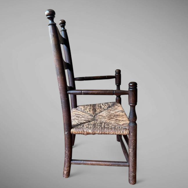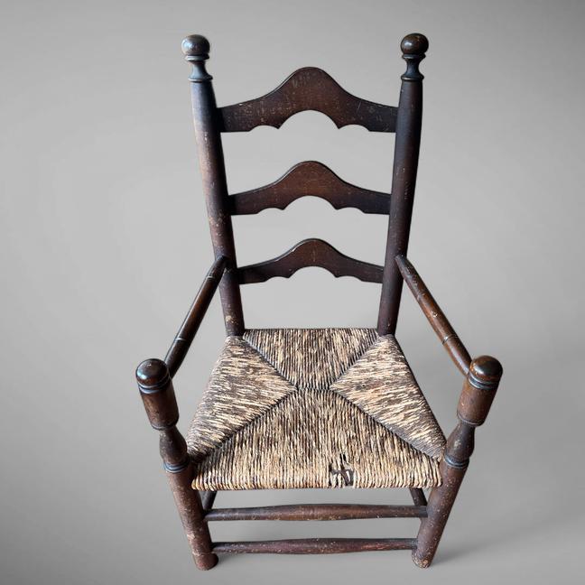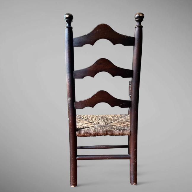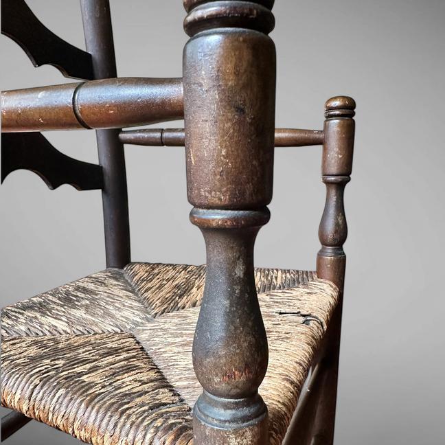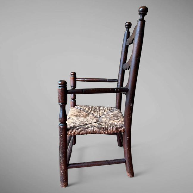 This wonderful child's chair has three fancy scalloped slats for the back, and boldly turned front posts ending in subtle mushroom caps. The two back posts terminate in nicely worn, round finials. The seat is of tightly woven rush that appears to be original. The overall patina on this chair is outstanding. There is a small worn area on the front edge of the rush seat that doesn't hurt its integrity at all. Other than that the chair is in perfect condition. Measuring " tall by " wide by " deep, with a seat height of ".
