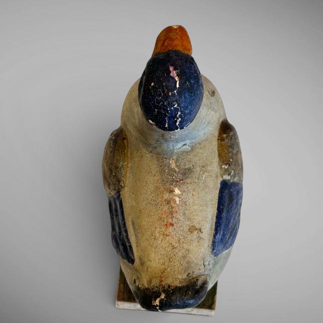 This early composition Squeak toy is in the form of a duck. It still retains its vibrant colors, with the wings appearing to have gold leaf on them. It is mounted on a wooden base, sides covered with soft kid leather. The squeak mechanism is not working, but it is still an unusual example. Measuring 4 1/4" w by 2 1/4" d by 4 1/2" t. Germany, ca 1860.