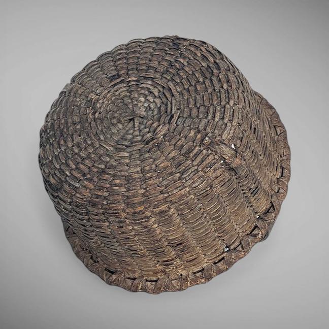 This early basket retains a heavy paint gray, with tiny remnants of white and black. This basket is somewhat heavy for its size. It has a nice tight weave and a double-wrapped rim. Notice the nice kick-up on the inside. Scattered, very minor, imperfections. See photos. Measuring 9 1/2" to 10" wide (very slightly out of round) by 9 1/2" to top of handle. A fine early painted basket!