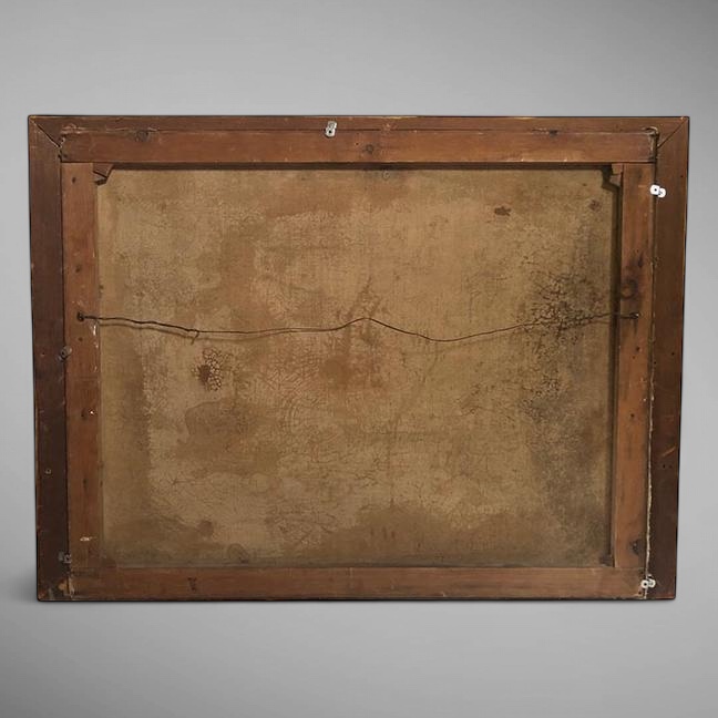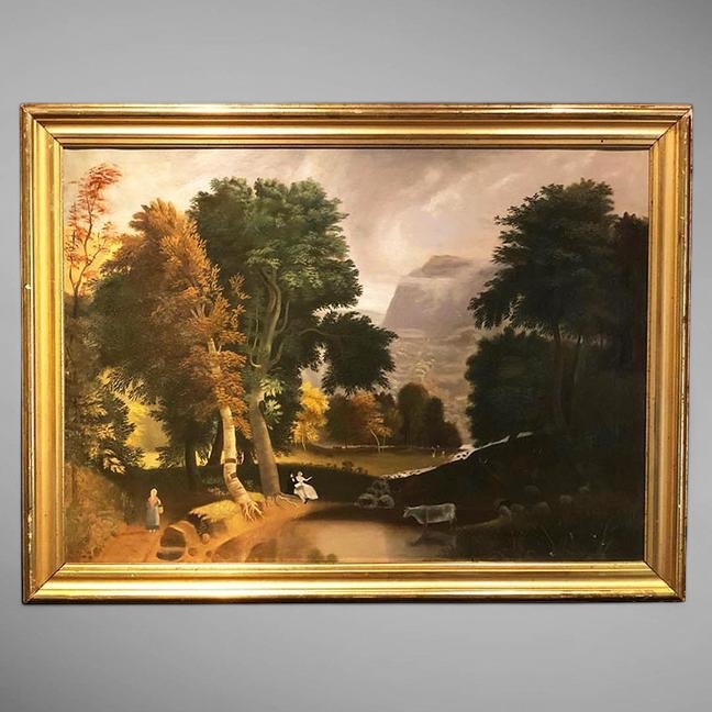 This lovely painting is finely executed, yet naive. The trees are quite remarkable, showing very fine detail. With a mountain and waterfalls in the background with a family looking over the brook that ends in a lower pond with a young couple seated on the bank, and an older woman, and various livestock. Unsigned. Measuring 29 x 36-1/4 in. Housed in a fine period carved gilt wood frame, 30-1/4 x 40-1/2. Craquelure, stretcher marks, and minor paint chips in lower right corner, all consistent with age. Could use a good cleaning. Frame with wear and rabbeted out to fit. All consistent with age.