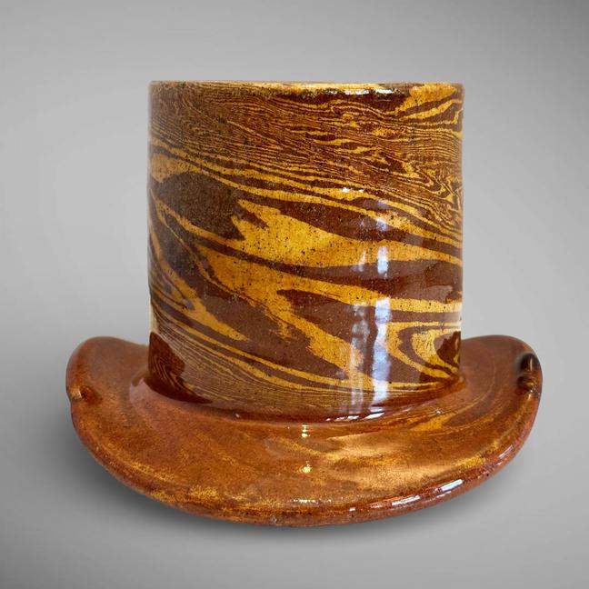 This is one of the more unusual examples I have seen. It is lead-glazed in the form of a top hat. In excellent condition. Measuring 4 1/4" tall by 5 5/8" in diameter at the rim, and 3 5/8" diameter at the top of the hat. Mid to late 19th century.