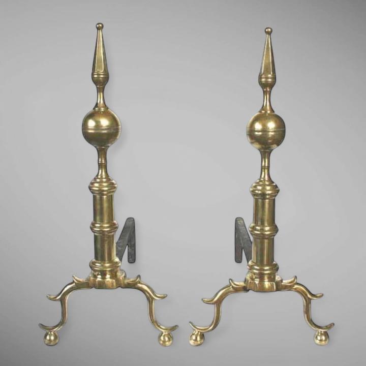 This pair of fine American federal brass steeple-top andirons was passed down through the family of Potter Palmer, who was a well known businessman and philanthropist, originally from Boston, who developed the “Gold Coast” along the Lake Michigan shoreline in Chicago in the 1800s and also built the famous Palmer House Hotel. These were purchased from the family estate and came from their Boston home. Ca. 1790-1810, A stunning pair in excellent condition. Measuring 22-1/2" tall by 11" wide at the base.